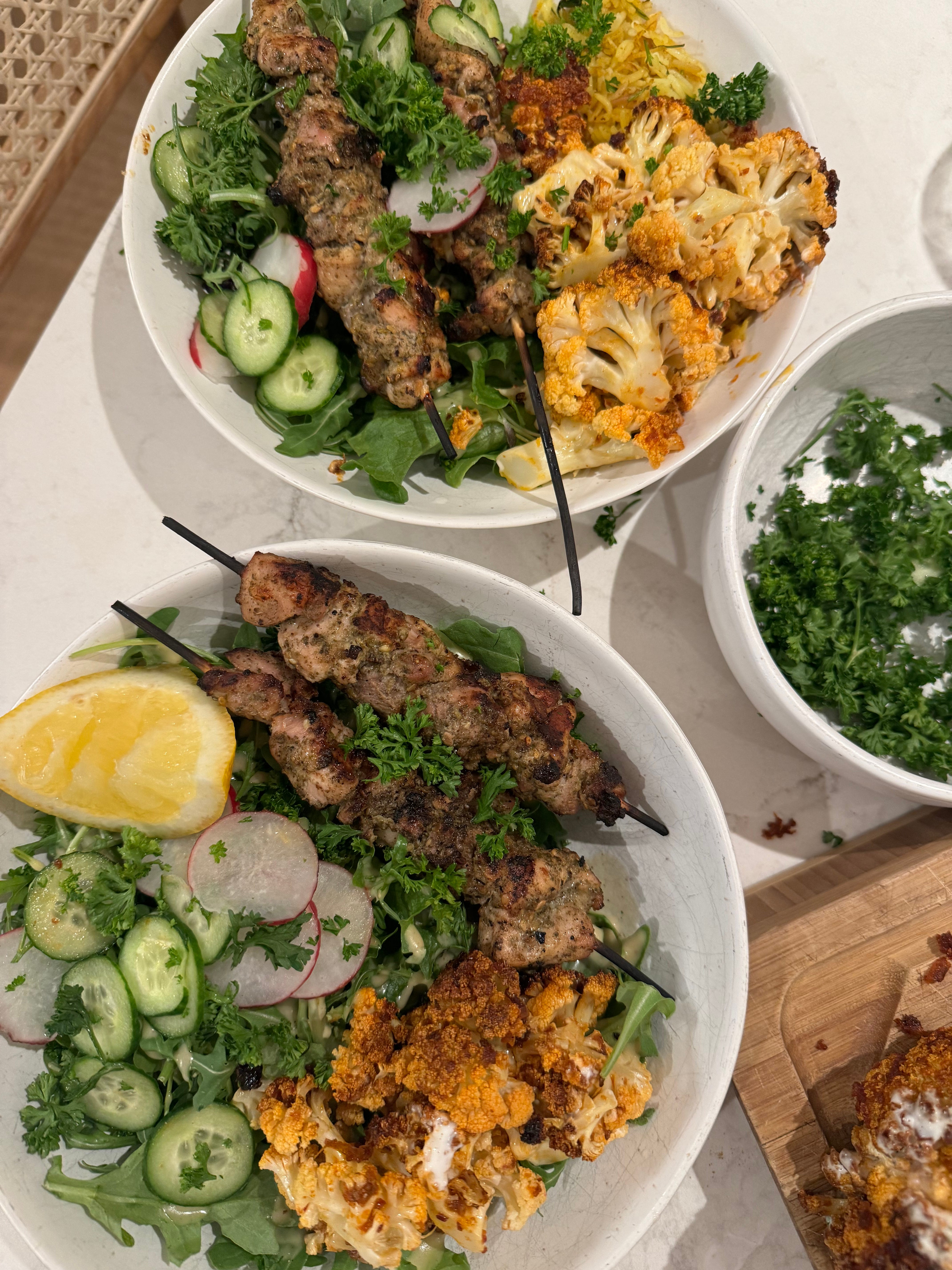 Owning your own business and being a mom, you are sort of always on the clock. This means that one day of forgetting to eat breakfast or having a croissant for lunch can really spiral the day. Time is also very tight, so I've gotten more strategic with what I cook. To provide a steady stream of energy and keep us full and happy, I've focused more on animal protein and non-starchy veggies to fill out my plate. Sesame soy steak and grilled bok choy. Crispy parmesan chicken cutlets on arugula. Miso ginger chicken with a crunchy napa slaw, Chickpea pasta broccoli mac and cheese, beef meatloaf with cauliflower gratin. Crowd pleasers, through the lens of a flavour-obsessed mama nutritionist. That being said, we always make room for fun food. Pizza and beer nights are a must in this house.